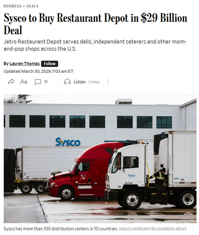 Sysco just announced it is acquiring Restaurant Depot in a deal valued at roughly $29 billion including debt. Restaurant Depot did around $16 billion in revenue last year and operates more than 160 locations across the U.S. On paper, this is about expanding reach into the independent restaurant market, capturing more volume, and generating synergies. That is how it will be framed.