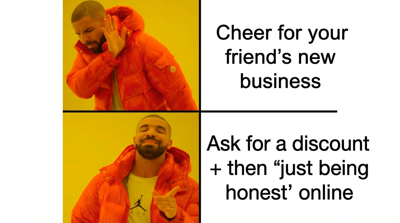 Second, there’s the group that “supports”… with conditions. The friends-and-family discount that somehow becomes a subscription. They’ll spend $80 on Uber Eats from a chain without blinking. They’ll buy the latest Real Madrid jersey for $160 because it dropped this week. But when it’s your business, they suddenly become negotiators: “Come on bro… help me out.” It’s casual, like your margin is a friendship test.